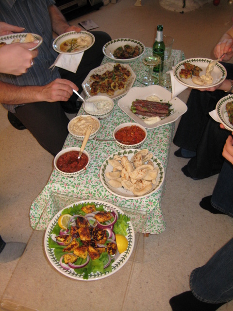 You would be forgiven, Uncle Graham's replicated shirt aside, for thinking I had switched to documenting any day of the year except Christmas Day, such is the spread below. It appears to feature chicken tikka, mini pitta breads accompanied by an assortment of dips (two salsas, hummus and a raita, I would guess), Parma ham-wrapped asparagus, mini stuffed halves of potato, and something else at the back that I can't quite make out, even with the full resolution photo. Answers on a postcard please. (They may not even be potatoes. In fact, Matt has since noted that they are ragu in pasta shells and that the final item in the distance is seekh kebab.)