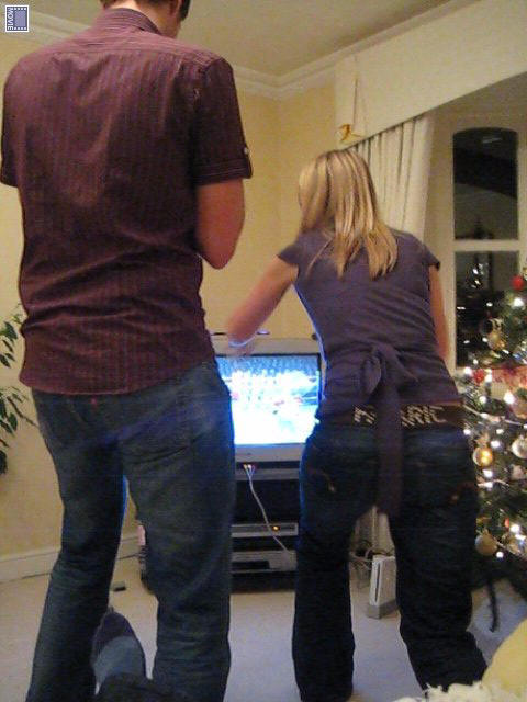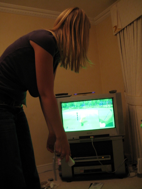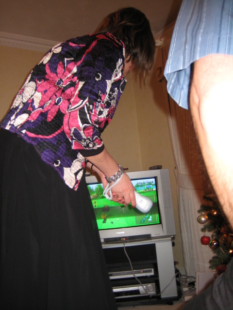 What you do need, after such an initial burst of consumption, is to burn off some of the calories with some light interactive action, such as golf on the Wii. Aunty Katie carefully lines up a shot which is difficult to pick up on the distinctly non-modern looking TV (we don't miss cathode ray tubes, do we). I daresay it was me who brought the Wii (although it could have been Aunty Katie's - she seemed well practised based on one of the videos), and it too became a feature of Christmases future (now past, of course).