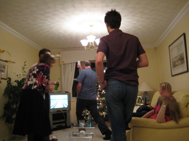 I had clearly grown tired of standing up to take photos, so I had retired to the far sofa, handily close to my lager beer, while the sporting action had moved to bowling. Mark gets into an impressively (and unnecessarily) committed position to deliver the ball down the, er, lane (unnecessary because the Wii has no regard as to, for example, the bend in your knee - it cares only about the direction and speed of movement of your hand holding the controller). Matt, seemingly free from kitchen duty right now, watches as on, as of course does the ever-present Uncle Graham, while I am being pointed at by Katie and Lynne. I expected them to be using different fingers if I'm honest.