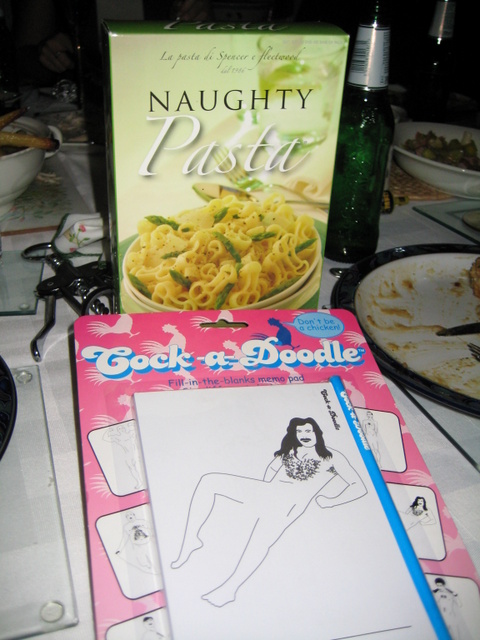 This appears to be my presents, although given there are two they are probably mine and Lynne's combined. I'm guessing mine is the "naughty" pasta (probably the most self-consciously named rude present here - like a small child covering their mouth after accidentally saying the word "bum" and saying "that was naughty!") and Lynne's the wipe-clean (always useful) "Cock-a-Doodle" sketch pad.