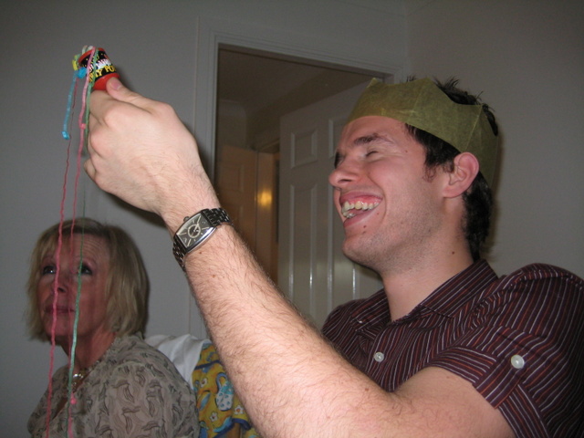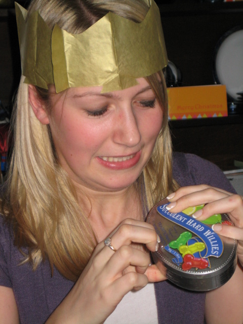 Katie's plate contents appear not to have changed much since the last photo so these are all in quick succession it would seem. Her plate, and Matt's, are in distinct contrast to AJ's. That's what opening rude presents does to you - it distracts. I shudder to think what's on the cards that Matt appears to be shuffling. There is a pleasing number of bottles of Grolsch on the table. But wait, what is that present that Katie has?