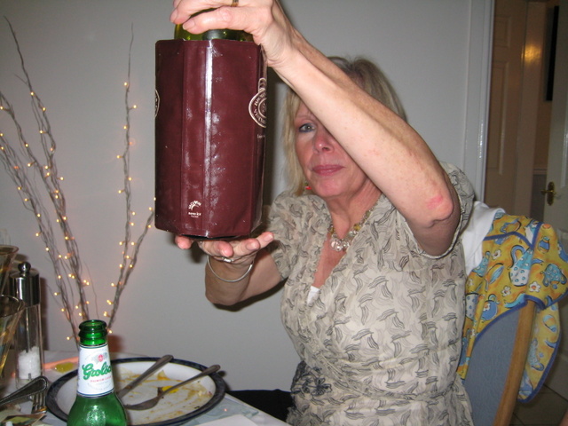 Occupying what could be viewed as chef's seat, nearest the kitchen, Nana Sue proudly displays her bottle chilling, um, sheath. (Sorry, I hesitated using such a word given the previous content. But I think it's fine.) It also looks like I got in close for the photo just as it was pushed towards me, resulting in a bit too much of a close-up. Every day's a school day, huh.