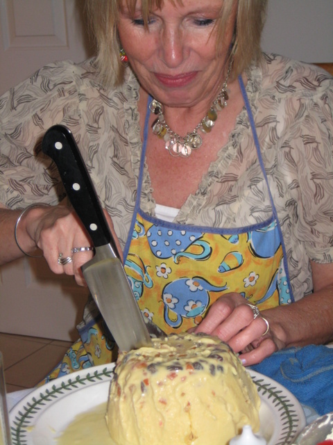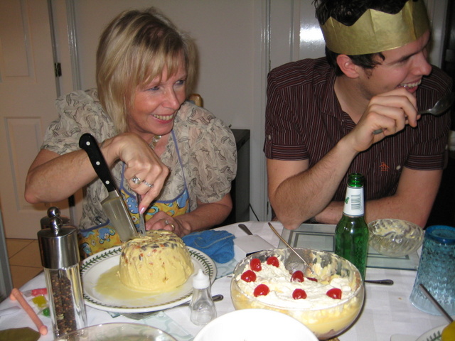 Aunty Janet goes for a more horizontal technique, the success of which we have no idea. Uncle Graham's elbow makes an unwelcome intrusion. (Poor photography, you might say, and you'd be right.)