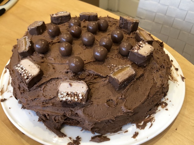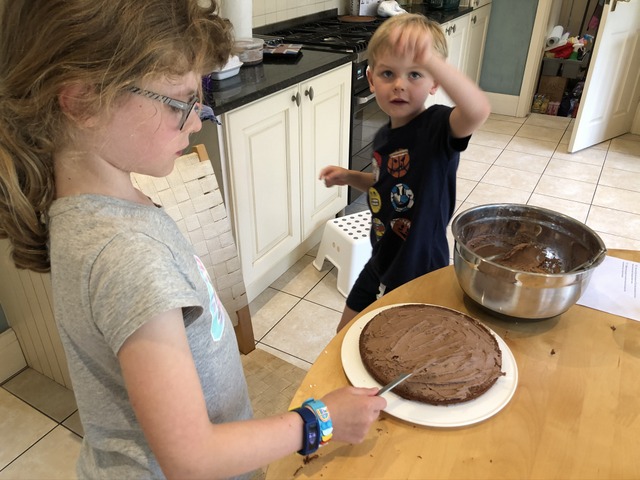 Next step is to dance around while Daisy spreads chocolate icing onto the first layer of cake.