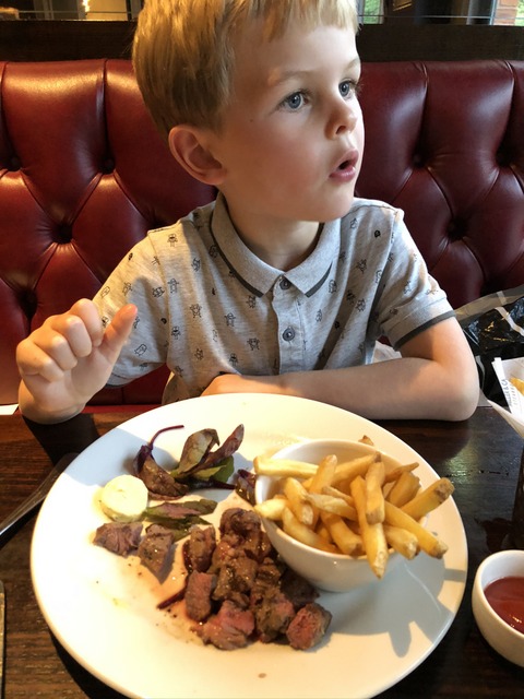 In the evening, we went for steak at Miller & Carter down the road. Gregory was sufficiently sophisticated to have medium or medium-rare steak. Also nice to see a collared T-shirt - making a bit of an effort.