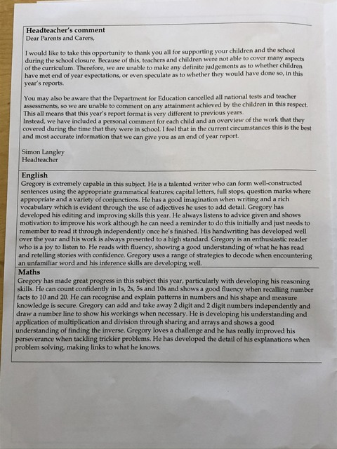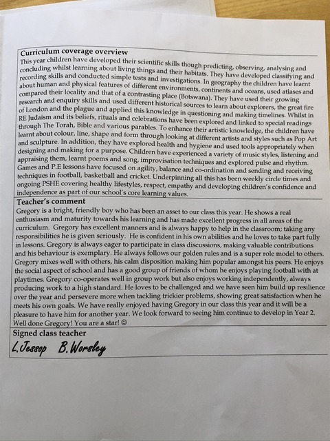 As we approached the end of the school year - Year 1 for Gregory - we get the school report, in a strange school year given the lockdown closures that everyone had to deal with (as it notes in the head teacher's comment. Whilst the comments on English and Maths are obviously positive, it's the teacher's (or teachers') comments that bring a particular smile to the face. Phrases such as "asset to [the] class", "excellent manners", "always happy to help" and "a super role model" are something that we, as parents, can be very proud of indeed.