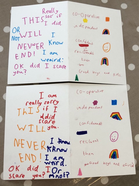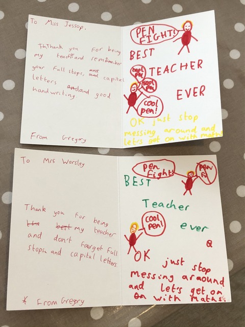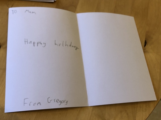 Gregory went to town on the cards for the teachers (in contrast to Lynne's birthday card), engaging in some kind of internal monologue written down.