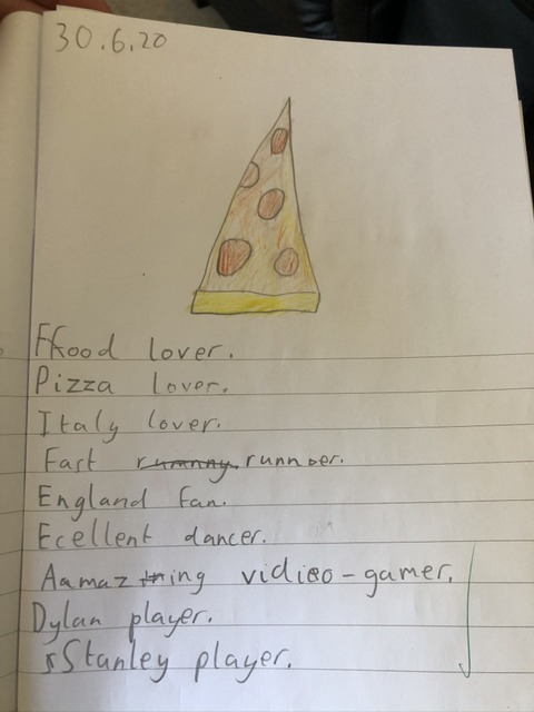 When looking through his schoolbooks, I found this little gem, which could be described as "Gregory in a nutshell". I can definitely vouch for the love of pizza (neatly threading the food and Italy loves together), as well as his running speed and dancing skills. Not quite as sure about his video gaming ability, but he didn't at that time have the experience under his belt that I, a gaming veteran, has. I'm not quite clear what "Dylan player" or "Stanley player" mean, apart from maybe simply that he plays with them.