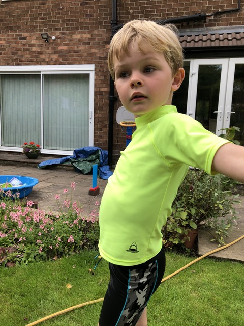 Later that day, the weather is clearly sufficiently warm for some garden water antics, as Gregory has changed to his skin-tight swimming gear.