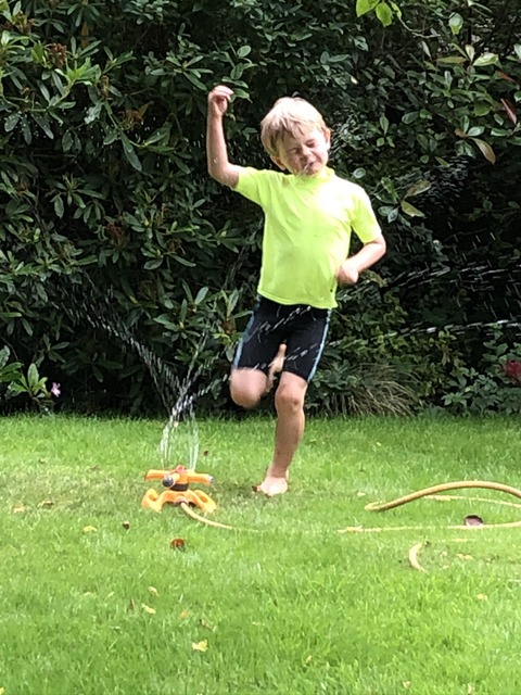 Later that day, and just because you can't see anyone any more doesn't mean you can't have fun. We've got the football nets, a sun-shielding tent with what seems like a towel cover, some plastic bits and bobs in a bucket, and the sprinkler. Less hassle than a paddling pool to set up but endless fun when the kids repeatedly run past it.