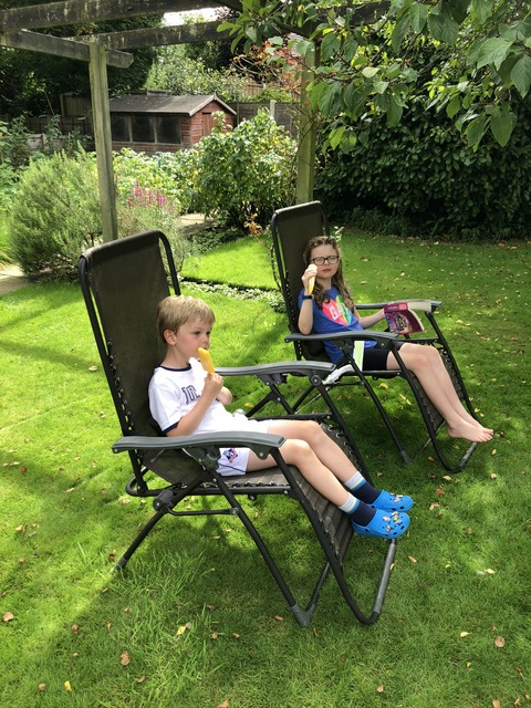 With restrictions relaxed, the Schofields came down for a visit, particularly since we are approaching Lynne's birthday Gregory is reading what looks like a huge book (my guess is that it is the Star Wars trilogy - episodes I to III in one single paperback). Avis fulfils an important role as bookmark holder. And still the sun shines.