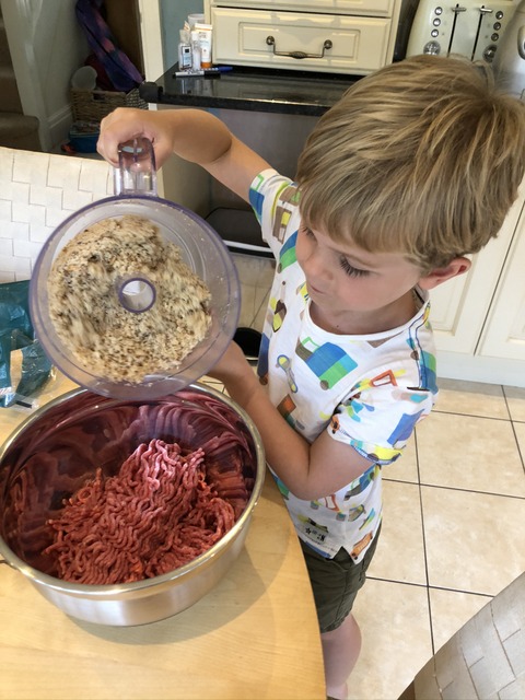 The next day, I have obviously decided that it's time for a BBQ, as we're making burgers, with Gregory tipping breadcrumbs into the minced beef.
