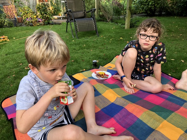 Here we enjoy the BBQ sat on the blanket in the garden, with Gregory seemingly having changed his T-shirt.