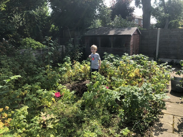 At peak summertime, the jungle, I mean, vegetable patch is in full flow, with Gregory almost looking lost within it. He's got a garden fork in his hand and he is digging up some potatoes.
