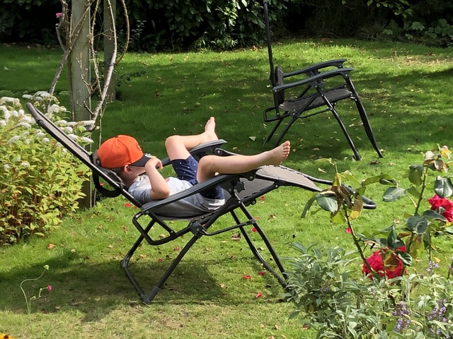 Clearly tired by that activity, he reclines in a garden chair, although this is actually four hours later. Don't try that position at home, kids.