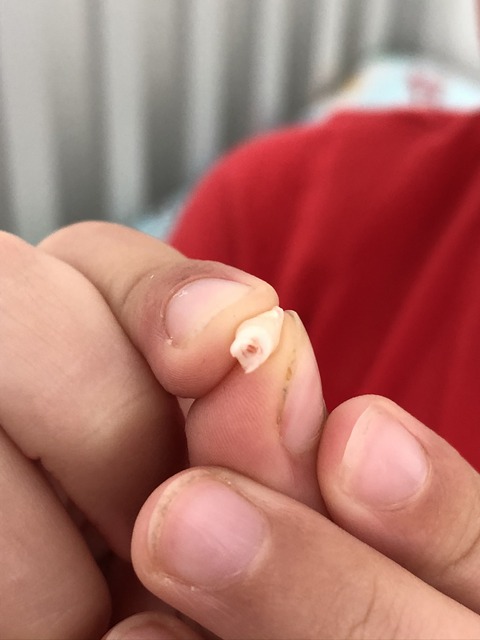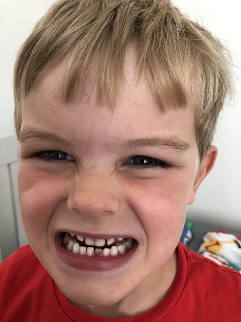 It's incisor replacement time, as Gregory poses to show where it came from and what it looks like. It's not immediately obvious to see where it has come from, since the apparent gap already has a tooth ready to go in its place. It must have been long overdue for its exit if indeed that it is where it came from.