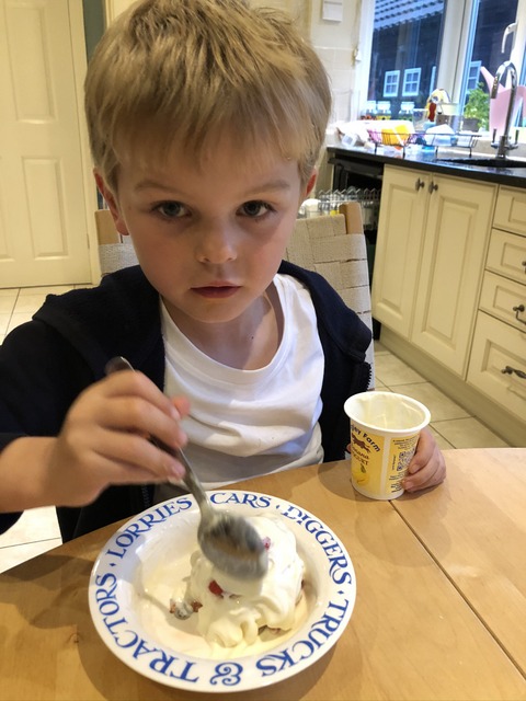 This is later in the evening, so he's got out of bed to go and pick some strawberries. He is very much relishing tucking into this one. It does look juicy and ripe. I say "pick strawberries" - hopefully this was home grown.