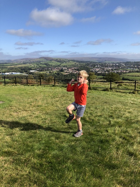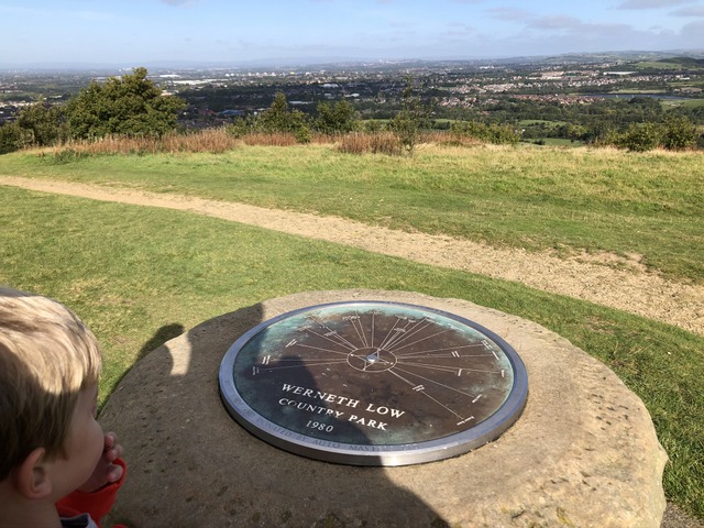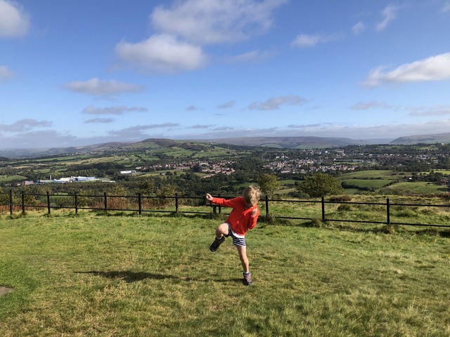 We're nearly at the end of September and, after the combination of Eat Out To Help Out and going back to school, we were soon back into a semi-lockdown situation (offices were generally closed, so I was back to working from home). This weekend, we were meant to be at the Barlows' extravaganza and staying over, but it was all cancelled (I had at least managed to get to the wedding of Rob and Lauren the previous weekend, with attendance reduced to 30, including the bride and groom). So on the Sunday we did what we had done many times throughout the year: head to the hills. This time, we went to Werneth Low Country Park, where Gregory is inspecting the scenery.