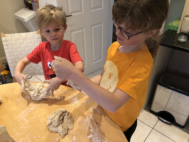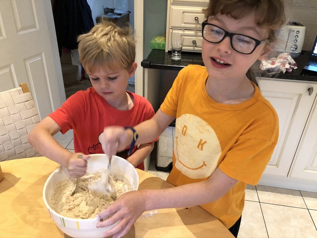 It's time for novelty bread making time, as the kids mix the dough.