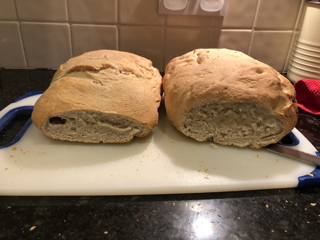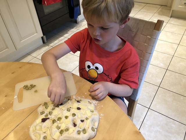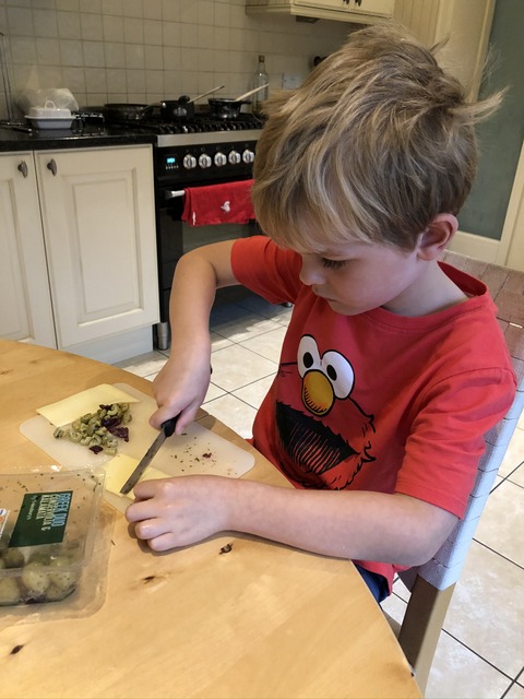 Gregory's preparing a bread filling of olives and cheese (slices), which he appears to be cutting with the wrong side of the (serrated) knife. It seems to be working regardless.