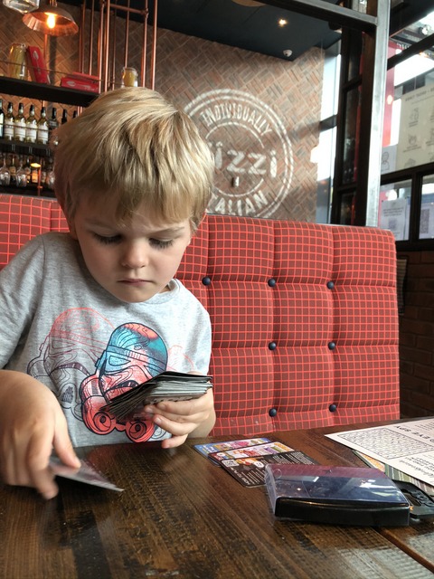 Our standard approach to restaurants, which survives to this day (early 2026), is to take some entertainment, particularly cards, to provide entertainment while we wait for the food (or waiter/waitress) to arrive. I'm not sure which cards these are, but Gregory seems pretty engrossed.
