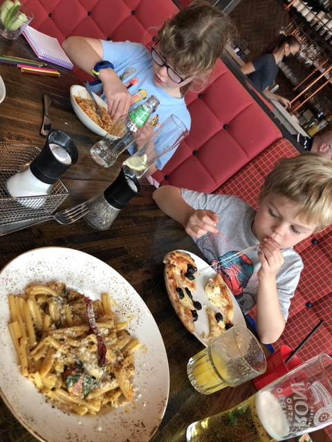 The food did, thankfully, arrive. The kids kept to type, which is Daisy tucking into (tomato) pasta and Gregory into (olive) pizza. My default position was to get a Peroni lager beer.