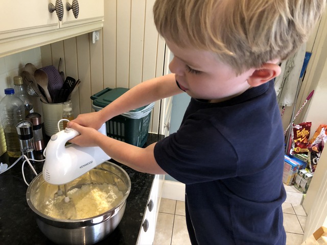 I obviously felt comfortable letting Gregory loose with the electric whisk to get the icing mixture to the right consistency. No splatter evident.