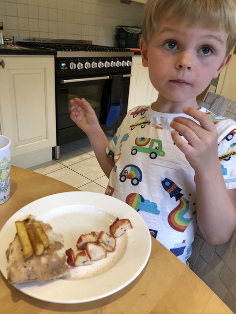 This is later in the evening, so he's got out of bed to go and pick some strawberries. He is very much relishing tucking into this one. It does look juicy and ripe. I say "pick strawberries" - hopefully this was home grown.
