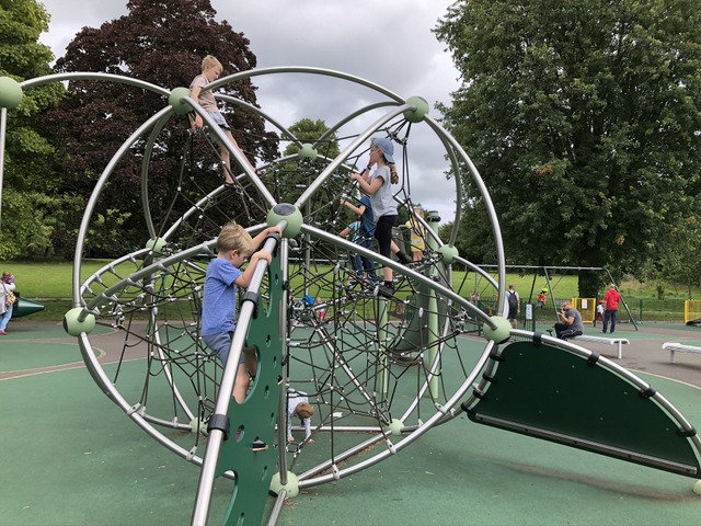 When they were back, I took a day off and we went to Torkington Park in Hazel Grove, seemingly just for more climbing frame action. Daisy is in the background, cap on backwards.
