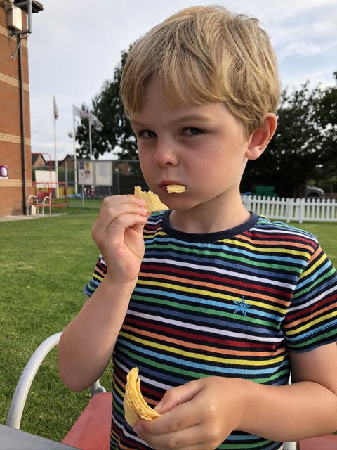 This was one of the rare occasions that Gregory was allowed to go to cricket. A nutritious meal of Pringles satiates our keen cricketer.