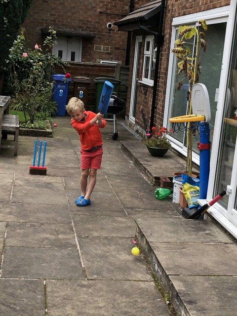 We've reached the weekend now (not that Gregory would notice much given it's the school holidays) and it's time for some cricket action. Unfortunately, as noted above, due to the lockdown situation, Gregory had relatively few (perhaps two) opportunities to take part in the Heaton Mersey cricket club training, so here he is in the back garden with an immaculate straight bat shot (although if I am being ultra-critical, he has stepped a little far outside of leg stump, perhaps influenced by the pitch layout, with the house forming an impervious legside block). The sandpit operates as an immobile but cavernous first slip.