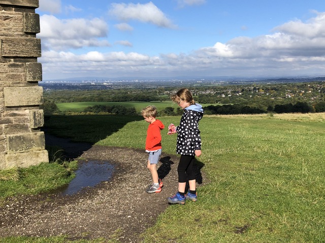 We're nearly at the end of September and, after the combination of Eat Out To Help Out and going back to school, we were soon back into a semi-lockdown situation (offices were generally closed, so I was back to working from home). This weekend, we were meant to be at the Barlows' extravaganza and staying over, but it was all cancelled (I had at least managed to get to the wedding of Rob and Lauren the previous weekend, with attendance reduced to 30, including the bride and groom). So on the Sunday we did what we had done many times throughout the year: head to the hills. This time, we went to Werneth Low Country Park, where Gregory is inspecting the scenery.